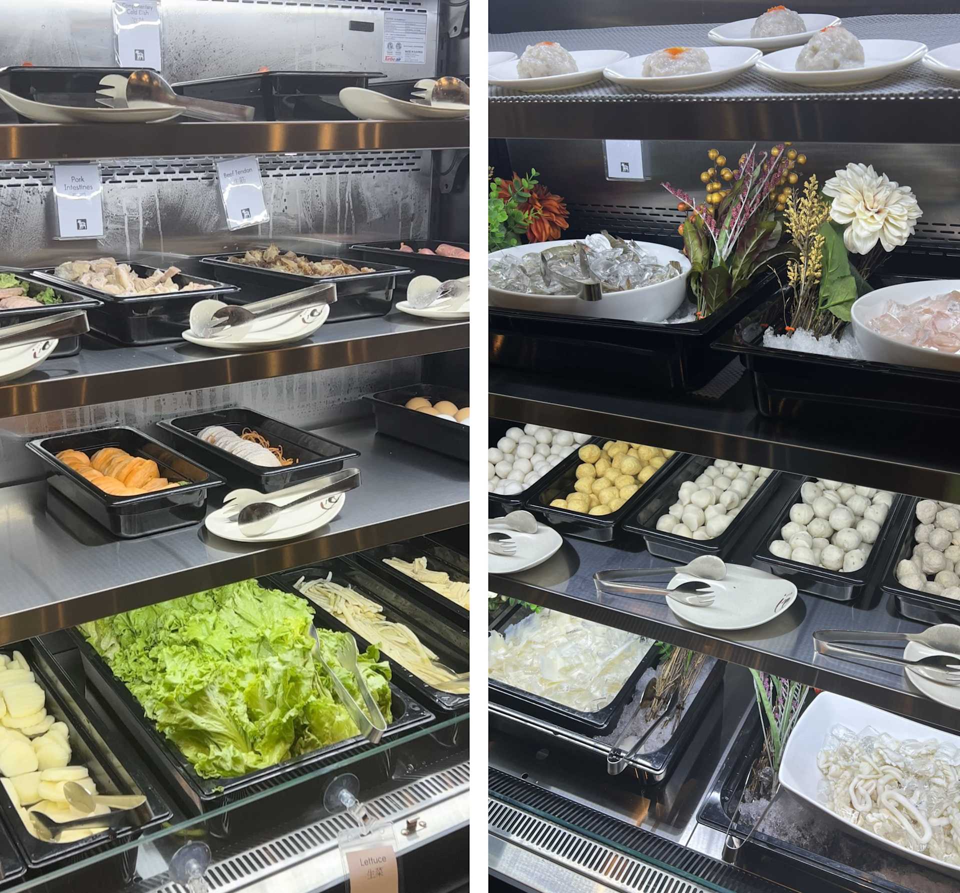 The food menu is extensive complete with lamb, beef, chicken breast, pork and beef marinade, and a variety of other self serve options on veggies, noodles, balls and sea food.